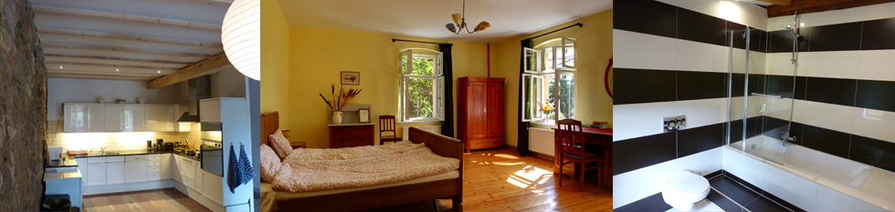 Beide Wohneinheiten A & B im Ferienhaus Domstolat verfügen jeweils über eine volleingerichtete Küche und Wohnzimmer. Im Mietpreis inbegriffen sind unter anderem: Geschirrtücher, Bettwäsche und ein Set Badetücher, sowie WLAN Internetzugang.